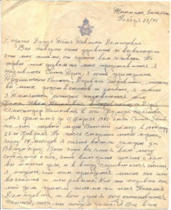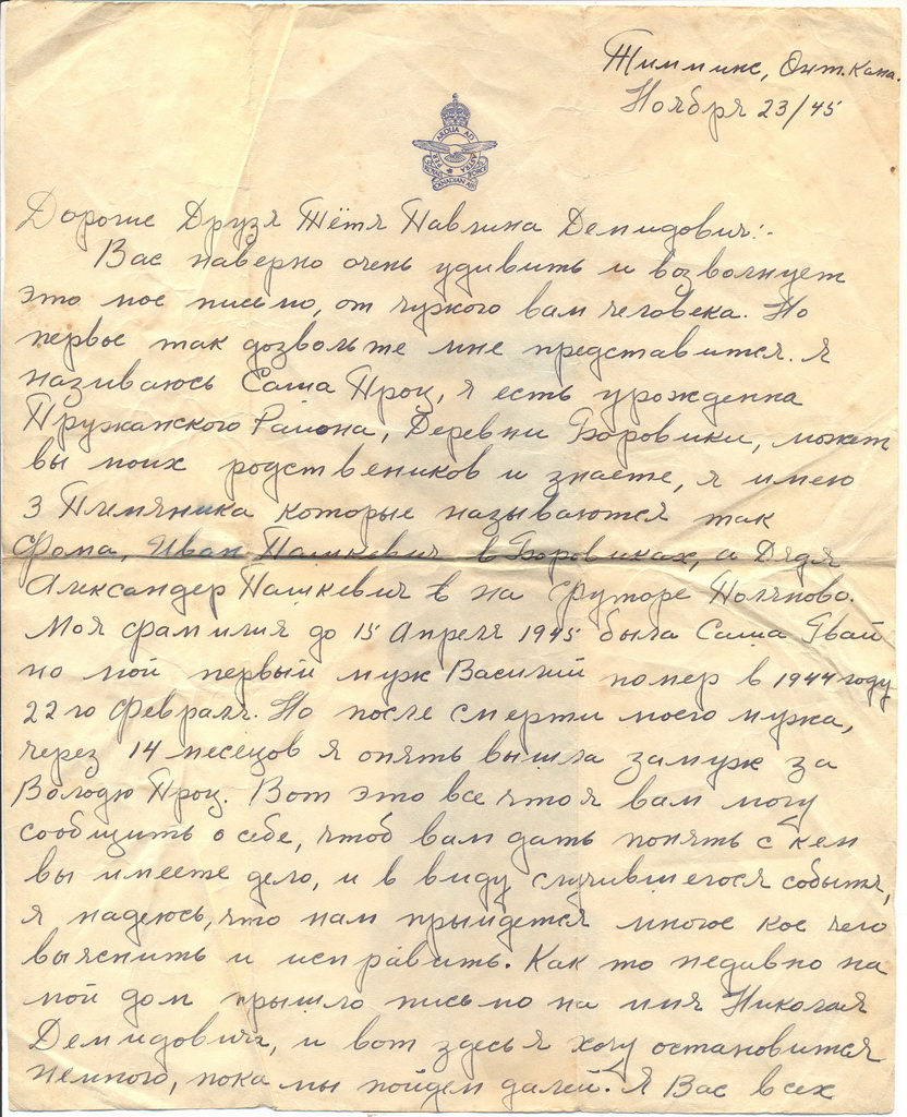 Моя фамилия до 15 апреля 1945 была Саша Гвай но мой первый муж Василий помер в 1944 году 22 го февраля. Но после смерти моего мужа, через 14 месяцов я опять вышла замуж за Володю Проц. Вот это все что я вам могу сообщить о себе, чтоб вам дать понять с кем вы имеете дело, и в виду случившегося события, я надеюсь, что нам прыйдется многое кое чего выяснить и исправить. Как то недавно на мой дом прышло письмо на имя Николая Демидовича, и вот здесь я хочу остановиться немного, пока пойдем дальше. Я вас всех