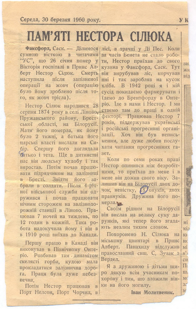 Факсфорд, Саск. — Ділимося сумною вісткою з читачами “УС”, іцо 26 січня помер у Вікторія госпіталі в Принс Алберт Нестор Сілюк. Смерть наступила після запізненої операдії на жовч (операцію було йому зроблено після того, як жовч трісла).